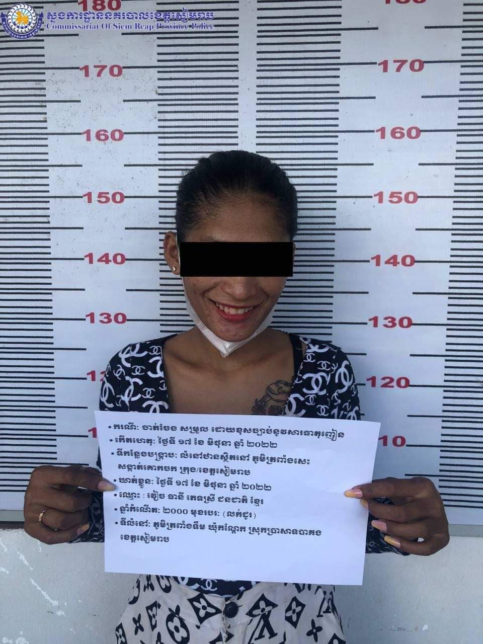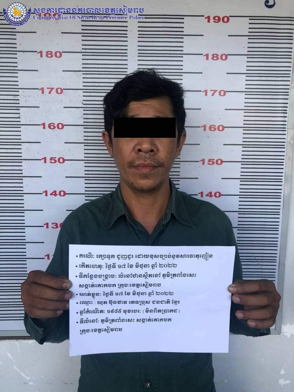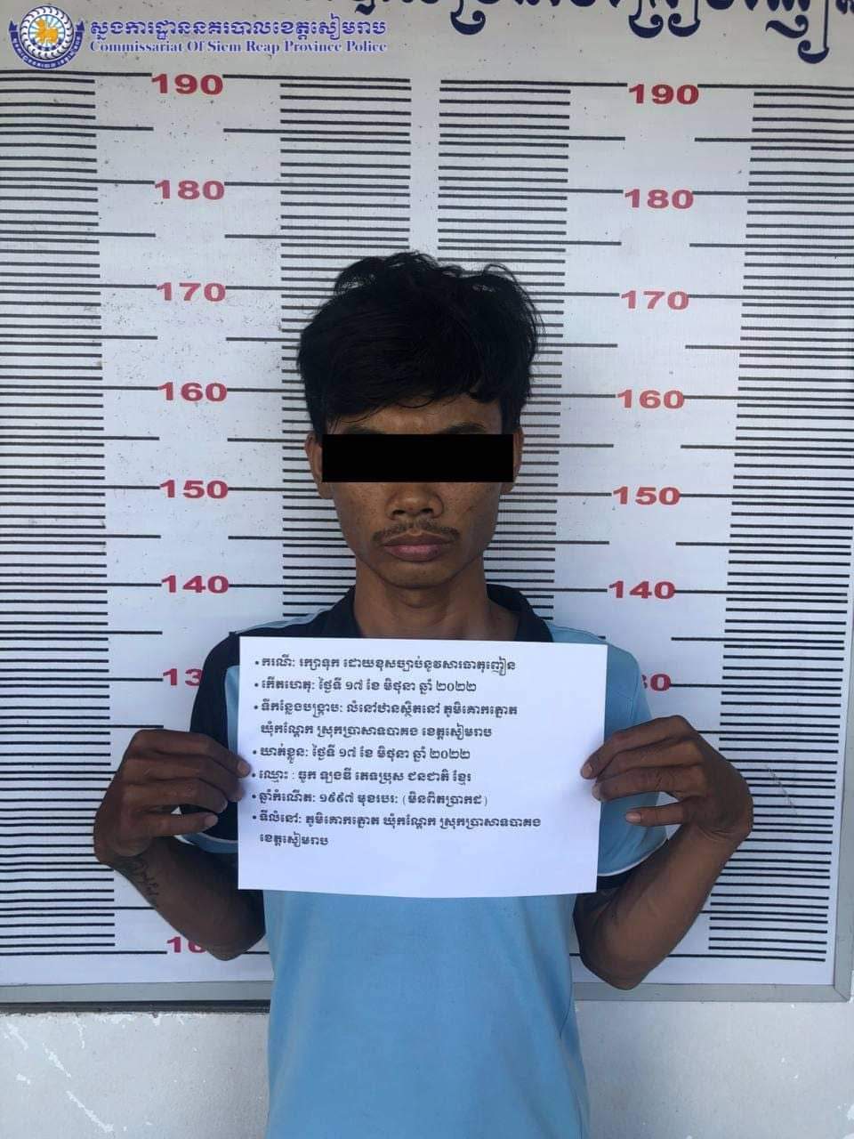 សមត្ថកិច្ចបានឱ្យដឹងថា : នៅថ្ងៃព្រហស្បតិ៍២រោច ខែ ជេស្ធ ឆ្នាំខាល ចត្វាស័ក ព.ស ២៥៦៦ ត្រូវនឹងថ្ងៃទី ១៦ ខែ មិថុនា ឆ្នាំ២០២២ វេលាម៉ោង ២២:០០នាទី កម្លាំងការិយាល័យប្រឆាំងគ្រឿងញៀនបានចូលរួមសហការជាមួយកម្លាំងផ្នែកប្រឆាំងគ្រឿងញៀននៃអធិការដ្ឋាននគរបាលស្រុកប្រាសាទបាគង ចុះបង្ក្រាបបទ រក្សាទុក និងប្រើប្រាស់ដោយខុសច្បាប់នូវសារធាតុញៀន នៅចំនុចលើដងផ្លូវស្ថិតនៅភូមិគោកត្នោត ឃុំកណ្តែក ស្រុកប្រាសាទបាគង ខេត្តសៀមរាប ឃាត់ខ្លួនជនសង្ស័យចំនួន ០១នាក់: