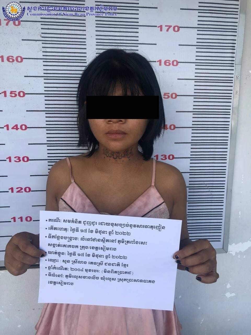 ក្រោយពីការស្តាប់ចម្លើយជនសង្ស័យខាងលើនៅថ្ងៃសុក្រ៣រោច ខែ ជេស្ធ ឆ្នាំខាល ចត្វាស័ក ព.ស ២៥៦៦ ត្រូវនឹងថ្ងៃទី ១៧ ខែ មិថុនា ឆ្នាំ២០២២ វេលាម៉ោង ១០ និង ០០នាទី កម្លាំងការិយាល័យប្រឆាំងគ្រឿងញៀនបានចូលរួមសហការជាមួយនិងកម្លាំងផ្នែកប្រឆាំងគ្រឿងញៀននៃអធិការដ្ឋាននគរបាលក្រុងសៀមរាប បានបន្តយកបក្ខពួកជាមេខ្លោងនៅចំនុចបន្ទប់ជួលស្ថិតនៅភូមិត្រពាំងសេះ សង្កាត់គោកចក ក្រុងសៀមរាបមានសារធាតុញៀន ឃាត់ខ្លួនជនសង្ស័យចំនួន០៥នាក់ ស្រី០២នាក់: