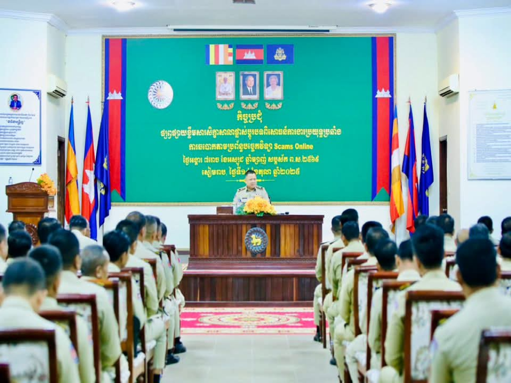 សៀមរាប ៖ នៅព្រឹកថ្ងៃអង្គារ ៧រោច ខែអស្សុជ ឆ្នាំម្សាញ់ សប្តស័ក ពុទ្ធសករាជ ២៥៦៩ ត្រូវនឹងថ្ងៃទី១៤ ខែតុលា ឆ្នាំ២០២៥ វេលាម៉ោង០៨:០០នាទី ដោយអនុវត្តតាមអនុសាសន៍ណែនាំដ៏ខ្ពង់ខ្ពស់របស់ ឯកឧត្ដម នាយឧត្ដមសេនីយ៍ ស ថេត អគ្គស្នងការនគរបាលជាតិ លោកឧត្តមសេនីយ៍ទោ ហួត សុធី ស្នងការ នៃស្នងការដ្ឋាននគរបាលខេត្តសៀមរាប បានអញ្ជើញដឹកនាំកិច្ចប្រជុំផ្សព្វផ្សាយខ្លឹមសារសិក្ខាសាលាផ្លាស់ប្តូរបទពិសោធន៍ការងារប្រយុទ្ធប្រឆាំងការឆបោកតាមប្រព័ន្ធបច្ចេកវិទ្យា Scam Online ។ ដោយបានការចូលរួមពី លោក-លោកស្រី ស្នងការរងទាំងអស់ លោកនាយការិយាល័យទាំង៣៣ លោកអធិការនគរបាលក្រុង-ស្រុកទាំង១៣ លោកនាយប៉ុស្តិ៍នគរបាលរដ្ឋបាលទាំង១០០ និងលោកនាយប៉ុស្តិ៍គោលដៅការពារបេតិកភណ្ឌទាំង៦ផងដែរ។