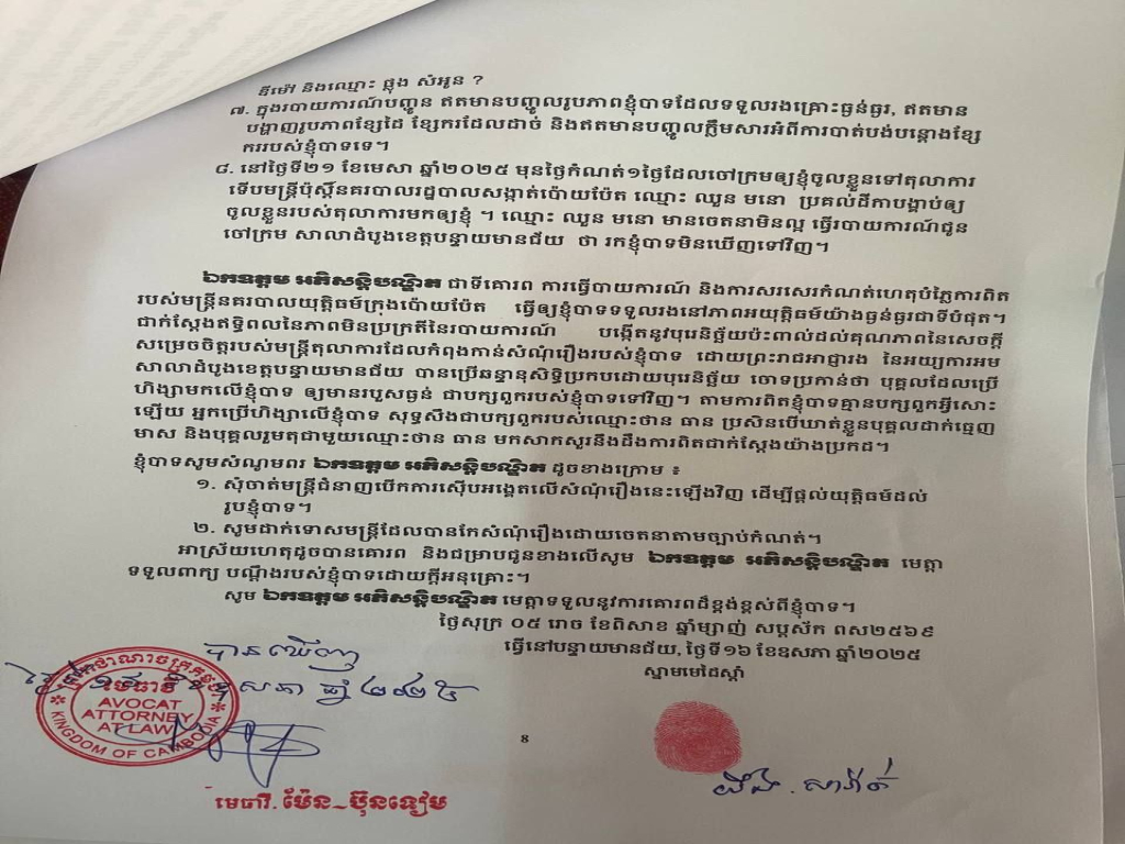 ៨. នៅថ្ងៃទី២១ ខែមេសា ឆ្នាំ២០២៥ មុនថ្ងៃកំណត់មួយថ្ងៃទើបខ្ញុំបាទបានទទួលដីកាបង្គាប់ឱ្យចូលខ្លួន។ ឈ្មោះ ឈួន មនោ ប្រគល់ដីកាបង្គាប់ឱ្យចូលខ្លួនរបស់តុលាការមកខ្ញុំបាទនៅថ្ងៃទី២០ ខែមេសា ឆ្នាំ២០២៥ បែជាឈ្មោះ ឈួន មនោ មានចេតនាមិនល្អធ្វើរបាយការណ៍ជូនចៅក្រមសាលាដំបូងខេត្តបន្ទាយមានជ័យថារកខ្ញុំបាទមិនឃើញទៅវិញ។