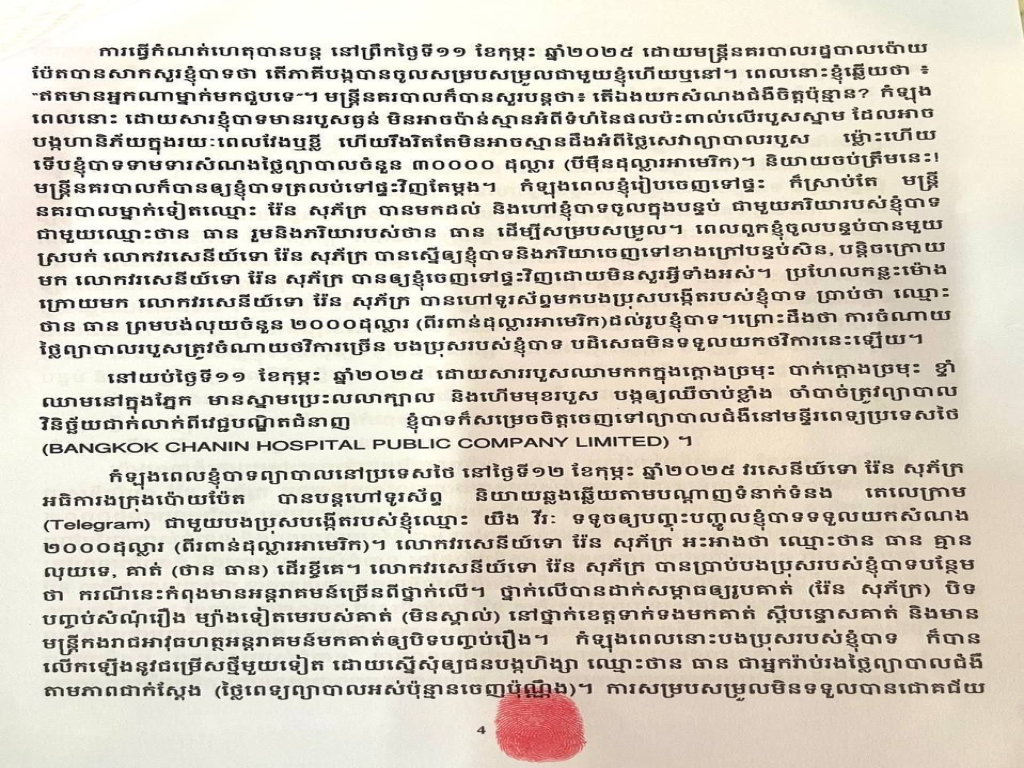 ៤. ពាក្យបណ្តឹងរបស់ខ្ញុំបាទប្តឹងឈ្មោះថាន ធាន ខ្ញុំបានរៀបរាប់ច្បាស់ៗថា ខ្ញុំឥតបានវាយឈ្មោះថាន ធាន សូម្បីមួយដៃតែខ្ញុំបានយកស្មាទៅប៉ះស្មារបស់គាត់ដោយហេតុគាត់អស់ជំហរគាត់បានដួលហើយស្រាប់តែមានបក្សពួកខាងគាត់វាយលើរូបខ្ញុំឱ្យរបួសធ្ងន់បែរជាក្នុងពាក្យបណ្តឹងសរសេរថា ខ្ញុំបាទបានវាយឈ្មោះថាន ធាន មួយដៃទៅវិញ។