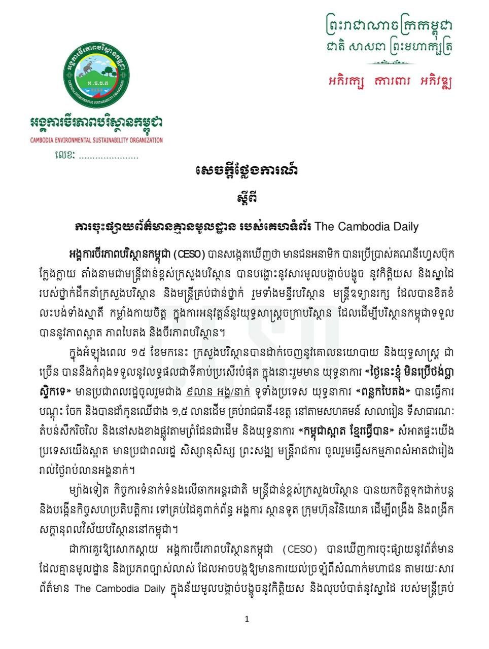 ជាការគួរឱ្យសោកស្តាយ អង្គការចីរភាពបរិស្ថានកម្ពុជា (CESO) បានឃើញការចុះផ្សាយនូវព័ត៌មាន ដែលគ្មានមូលដ្ឋាន និងប្រភពច្បាស់លាស់ ដែលអាចបង្កឱ្យមានការយល់ច្រឡំពីសំណាក់មហាជន តាមរយៈសារ ព័ត៌មាន The Cambodia Daily ក្នុងន័យមូលបង្កាច់បង្អួចនូវកិត្តិយស និងលុបបំបាត់នូវស្នាដៃ របស់មន្ត្រីគ្រប់ ជាន់ថ្នាក់នៃក្រសួងបរិស្ថាន បានខិតខំប្រឹងប្រែ ទាំងកម្លាំងកាយចិត្ត ការពារ ថែរក្សា ដាំដុះ សំអាត ដើម្បីបុព្វហេតុ ជាតិមាតុភូមិកម្ពុជា។