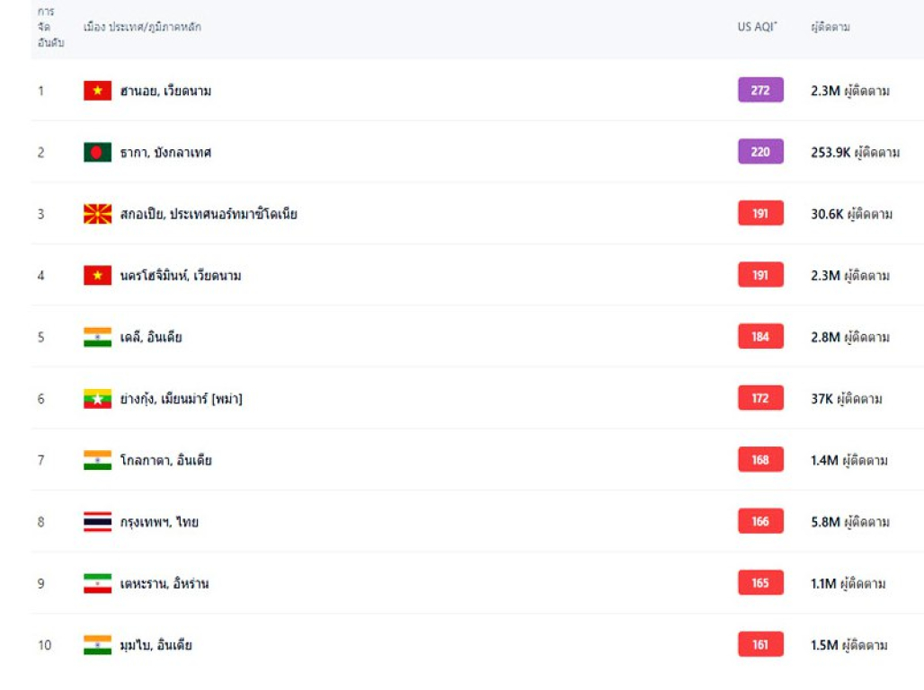 មជ្ឈមណ្ឌលព័ត៌មានគុណភាពអាកាសបាងកកបានសង្ខេបលទ្ធផលរង្វាស់ PM 2.5 ជា 40.7-65.4 មីក្រូក្រាម/ម៉ែត្រគូប រកឃើញលើសកម្រិតស្តង់ដារ និងស្ថិតក្នុងកម្រិតពណ៌ទឹកក្រូច ចាប់ផ្តើមមានផលប៉ះពាល់ដល់សុខភាពក្នុងតំបន់ចំនួន ៧០ ក្នុងអំឡុងថ្ងៃទី ៧-១៥ ខែមករា ឆ្នាំ ២០២៥ ។
