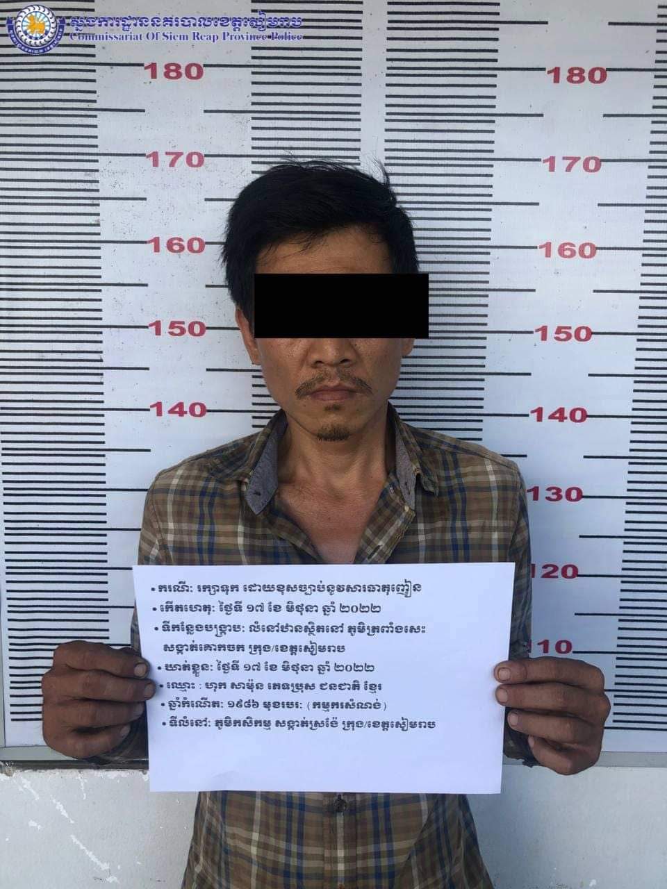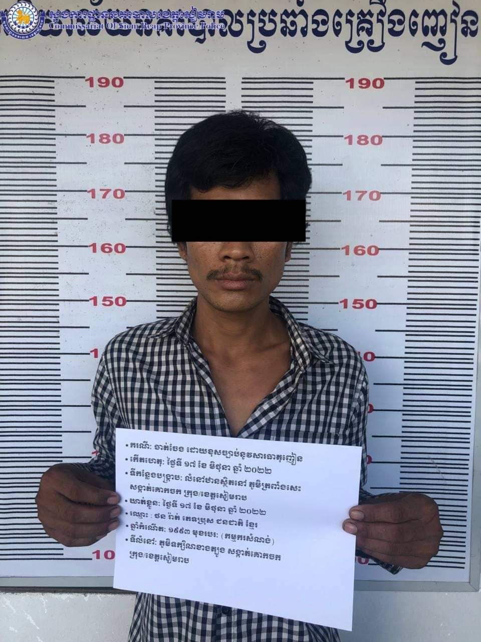 សមត្ថកិច្ចបានឱ្យដឹងថា : នៅថ្ងៃព្រហស្បតិ៍២រោច ខែ ជេស្ធ ឆ្នាំខាល ចត្វាស័ក ព.ស ២៥៦៦ ត្រូវនឹងថ្ងៃទី ១៦ ខែ មិថុនា ឆ្នាំ២០២២ វេលាម៉ោង ២២:០០នាទី កម្លាំងការិយាល័យប្រឆាំងគ្រឿងញៀនបានចូលរួមសហការជាមួយកម្លាំងផ្នែកប្រឆាំងគ្រឿងញៀននៃអធិការដ្ឋាននគរបាលស្រុកប្រាសាទបាគង ចុះបង្ក្រាបបទ រក្សាទុក និងប្រើប្រាស់ដោយខុសច្បាប់នូវសារធាតុញៀន នៅចំនុចលើដងផ្លូវស្ថិតនៅភូមិគោកត្នោត ឃុំកណ្តែក ស្រុកប្រាសាទបាគង ខេត្តសៀមរាប ឃាត់ខ្លួនជនសង្ស័យចំនួន ០១នាក់: