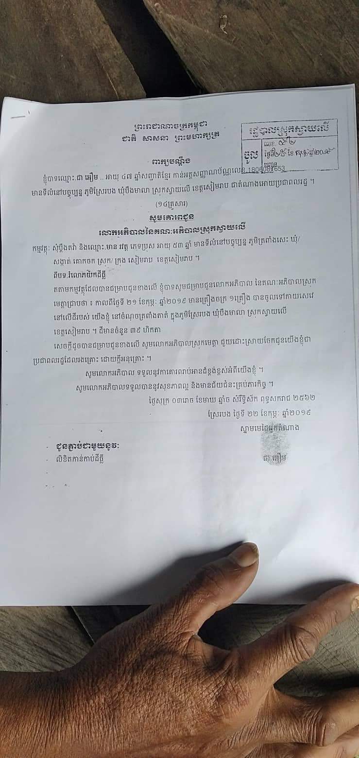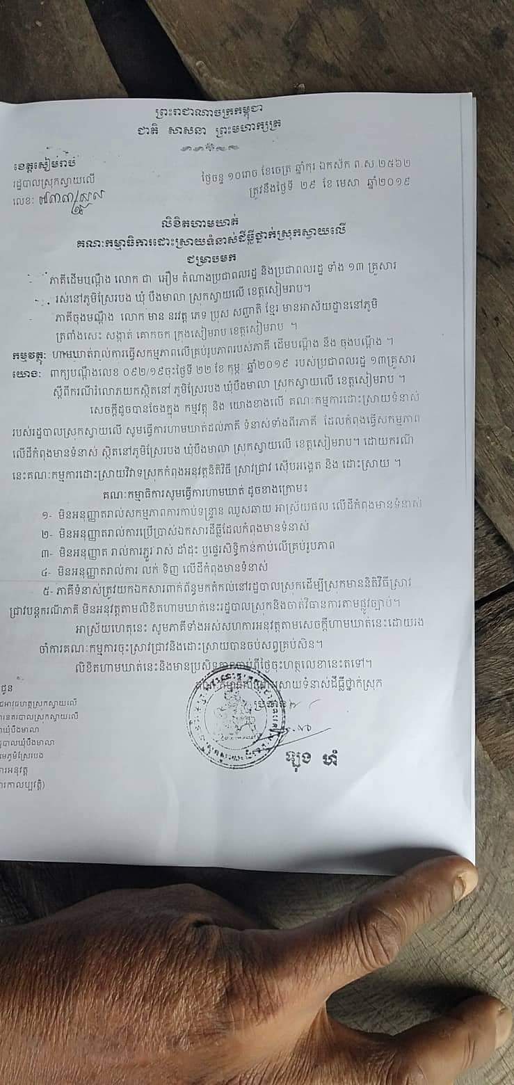 លោកឃួនឡុងគឺជាមេភូមិស្រែរបងបានលេីកឡេីងថាបងប្អូនប្រជាពលរដ្ឋទាំង១៤គ្រួសារនេះពិតជាបានកាន់កាប់ដីនិងអាស្រ័យផលលេីដីនេះជាយូរឆ្នាំណាស់មកហេីយគាត់មានតែដីបន្តិចបន្តួចនេះគ្រាន់ដាំដុះចិញ្ចឹមជីវិត្តតែប៉ុណ្ណោះ ហេតុដូចម្តេចបានជាឈ្មោះ មាន រវត្តមករំលោភបំពានយកដីបងប្អូនទៅវិញ។ពួកគាត់បានបញ្ជាក់បន្ថែមទៀតថាក្រោយពេលដែលឈ្មោះមាន រវត្តមកហាមឃាត់មិនឲ្យពួកគាត់អាស្រ័យផលលេីដីនេះរួច មួយរយ:ក្រោយមកទៀតស្រាប់តែពួកគាត់បានទទួលលិខិតហាមឃាត់លេខ៧៣៣/១៩សលចុះថ្ងៃទី២៩ ខែមេសា ឆ្នាំ២០១៩ របស់លោកឡុង ហំអភិបាលស្រុកស្តីទី ប្រធានគណ:កម្មការដោះស្រាយទំនាស់ដីធ្លីស្រុកស្វាយលេី ដែលមានខ្លឺមសារមានជាអាត% ហាមឃាត់ដាច់ខាតចំពោះភាគីដេីមបណ្តឹង ចុងបណ្តឹងមិនឲ្យឈូសឆាយ ភ្ជួររាស់ដាំដំណាំគ្រប់ប្រភេទលេីដីនេះដោយហេតុថា ដីកំពុងមានទំនាស់ល។លជាចុងក្រោយពួកគាត់សូមសំណូមពរដល់គណកម្មការដោះស្រាយទំនាស់ដីធ្លីស្រុកស្វាយលេី គណៈកម្មការដោះស្រាយទំនាស់ដីធ្លីខេត្តសៀមរាបមេត្តាជួយដោះស្រាយឲ្យពួកគាត់ផង ហេីយជាពិសេសពួកគាត់ក៍សូមសំណូមពរដល់ប្រមុខរាជរដ្ឋាភិបាលដែលមានសម្តេចតេជោ ហ៊ុន សែននាយករដ្ឋមន្រ្តីនៃព្រះរាជាណាចក្រកម្ពុជា សូមសម្តេចមេត្តាជួយពួកយេីងខ្ញុំផងពួកយេីងខ្ញុំពុំមានដីឯណាក្រៅពីនេះដេីម្បីដាំដុះចិញ្ចឹបជីវិតទេ ។