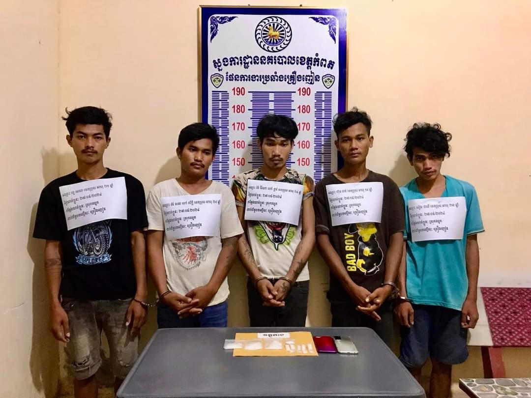 កាលពីរសៀលថ្ងៃទី 28.05.24 កំលាំងប៉ុស្ត៏រដ្ឋបាលឃុំតេជោអភិវឌ្ឍន៏នៃអធិការដ្ឋាននគរបាលស្រុកឈូក បានបង្ក្រាបករណីចែកចាយគ្រឿងញៀនមួយករណី ឃាត់ខ្លួនមុខសញ្ញាចែកចាយចំនួនប្រាំនាក់ និងដកហូតថ្នាំញៀនបាន ១៨ កញ្ចប់ ។ នេះបេីយោងតាមផេកផ្លូវការរបស់ស្នងការនគរបាលខេត្តកំពត