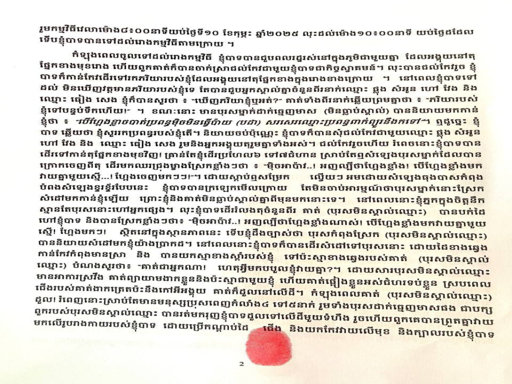 ៨. នៅថ្ងៃទី២១ ខែមេសា ឆ្នាំ២០២៥ មុនថ្ងៃកំណត់មួយថ្ងៃទើបខ្ញុំបាទបានទទួលដីកាបង្គាប់ឱ្យចូលខ្លួន។ ឈ្មោះ ឈួន មនោ ប្រគល់ដីកាបង្គាប់ឱ្យចូលខ្លួនរបស់តុលាការមកខ្ញុំបាទនៅថ្ងៃទី២០ ខែមេសា ឆ្នាំ២០២៥ បែជាឈ្មោះ ឈួន មនោ មានចេតនាមិនល្អធ្វើរបាយការណ៍ជូនចៅក្រមសាលាដំបូងខេត្តបន្ទាយមានជ័យថារកខ្ញុំបាទមិនឃើញទៅវិញ។