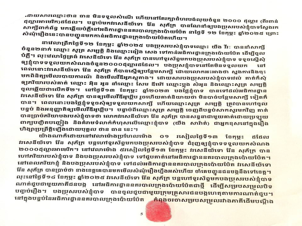 ៤. ពាក្យបណ្តឹងរបស់ខ្ញុំបាទប្តឹងឈ្មោះថាន ធាន ខ្ញុំបានរៀបរាប់ច្បាស់ៗថា ខ្ញុំឥតបានវាយឈ្មោះថាន ធាន សូម្បីមួយដៃតែខ្ញុំបានយកស្មាទៅប៉ះស្មារបស់គាត់ដោយហេតុគាត់អស់ជំហរគាត់បានដួលហើយស្រាប់តែមានបក្សពួកខាងគាត់វាយលើរូបខ្ញុំឱ្យរបួសធ្ងន់បែរជាក្នុងពាក្យបណ្តឹងសរសេរថា ខ្ញុំបាទបានវាយឈ្មោះថាន ធាន មួយដៃទៅវិញ។