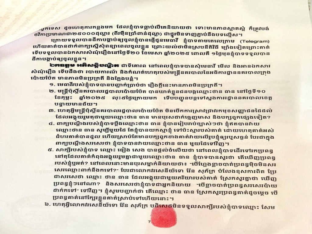 តាមពាក្យបណ្តឹងដែលសារព័ត៌មានយើងខ្ញុំទើបទទួលបាននៅថ្ងៃទី២១ ខែ ឧសភា ឆ្នាំ២០២៥ បានរៀបរាប់យ៉ាងលំអិតអំពីភាពមិនប្រក្រតីនៃការកសាងសំណុំរឿង និងភាពមិនប្រក្រតីចំពោះការអះអាងរបស់មន្ត្រីនគរបាលលើកឡើងអំពីអ្នកលូកដៃធ្វើអន្តរាគមន៍។